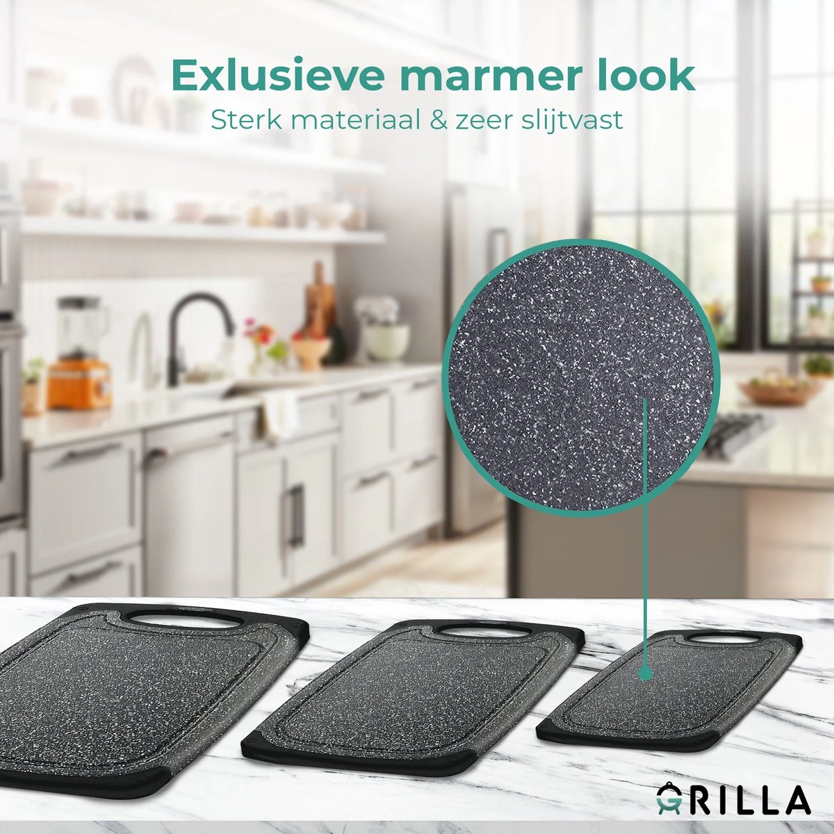 De Grilla snijplanken voor de keuken hebben diepe groeven die vlees en vruchtensappen opvangen. Zelfs tijdens de drukste kookmomenten is uw werkplek altijd schoon en overzichtelijk.